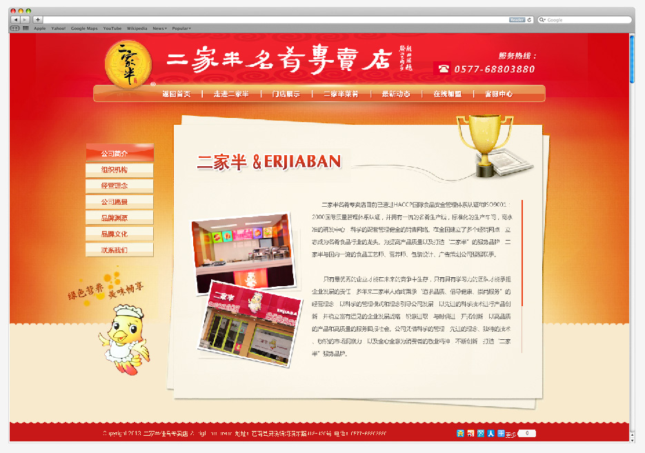 二家半名肴专卖店目前已通过HACCP国际食品安全管理体系认证和ISO9001:2000国际质量管理体系认证,并拥有一流的名肴生产线,标准化的生产车间,高水准的研发中心,科学的配套管理健全的销售网络。